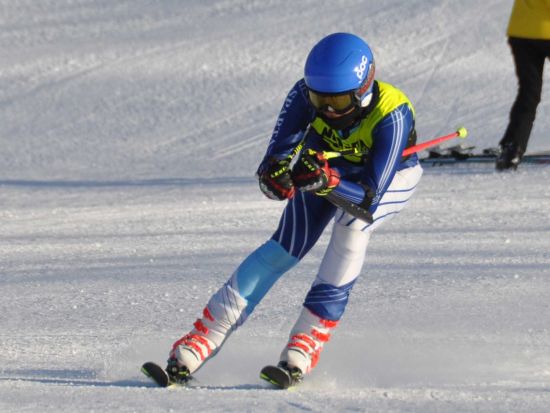 The panels on the giant slalom gates had all been lowered due to the near gale force winds that were dominating the mountain at Winter 4 Kids on Friday afternoon, Jan 29th, 2021. Although the sun was shining and the sky was blue, the temperatures were frigid, hovering in the mid-teens with a real feel of -2 degrees. The racecourse surface had been completely stripped of any light snow and the winds were blowing directly into the racers posing a challenge to their vision and speed.